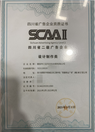 三足鳥(niǎo)文創(chuàng)獲得四川省二級(jí)廣告企業(yè)認(rèn)證